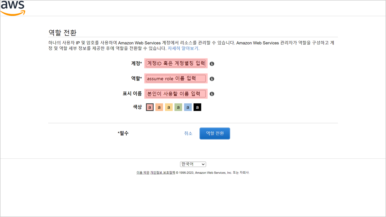역할 전환 세팅 화면이 나오면 다음과 같이 항목을 입력하고 오른쪽 하단의 ‘역할 전환’을 선택합니다.