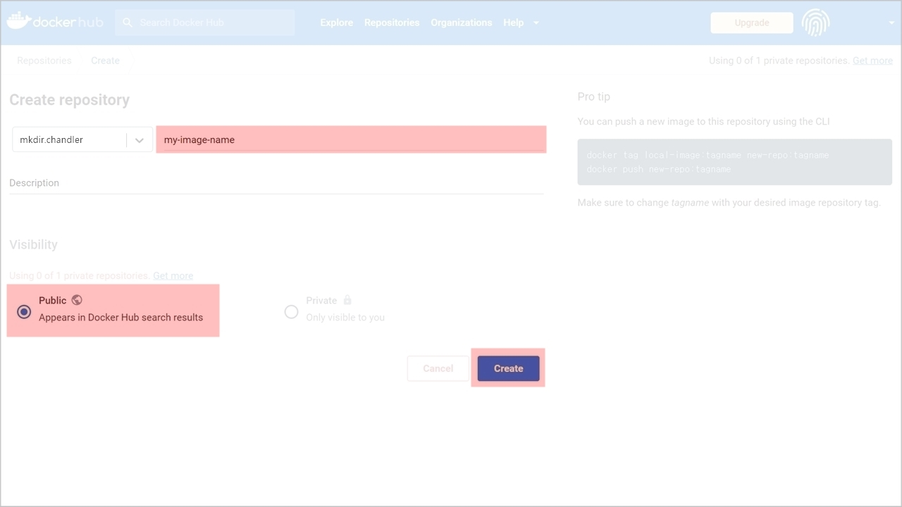 - 드롭 다운 메뉴의 오른쪽에 이미지 저장소 (repository) 이름을 입력합니다.