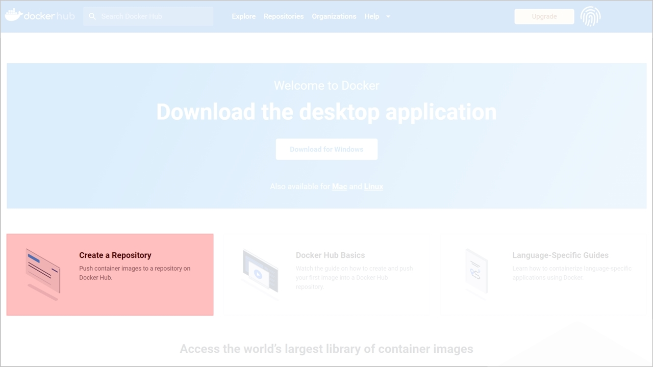 https://hub.docker.com 에 로그인 한 다음 화면 중앙의 ‘Create Repository’를 선택합니다.