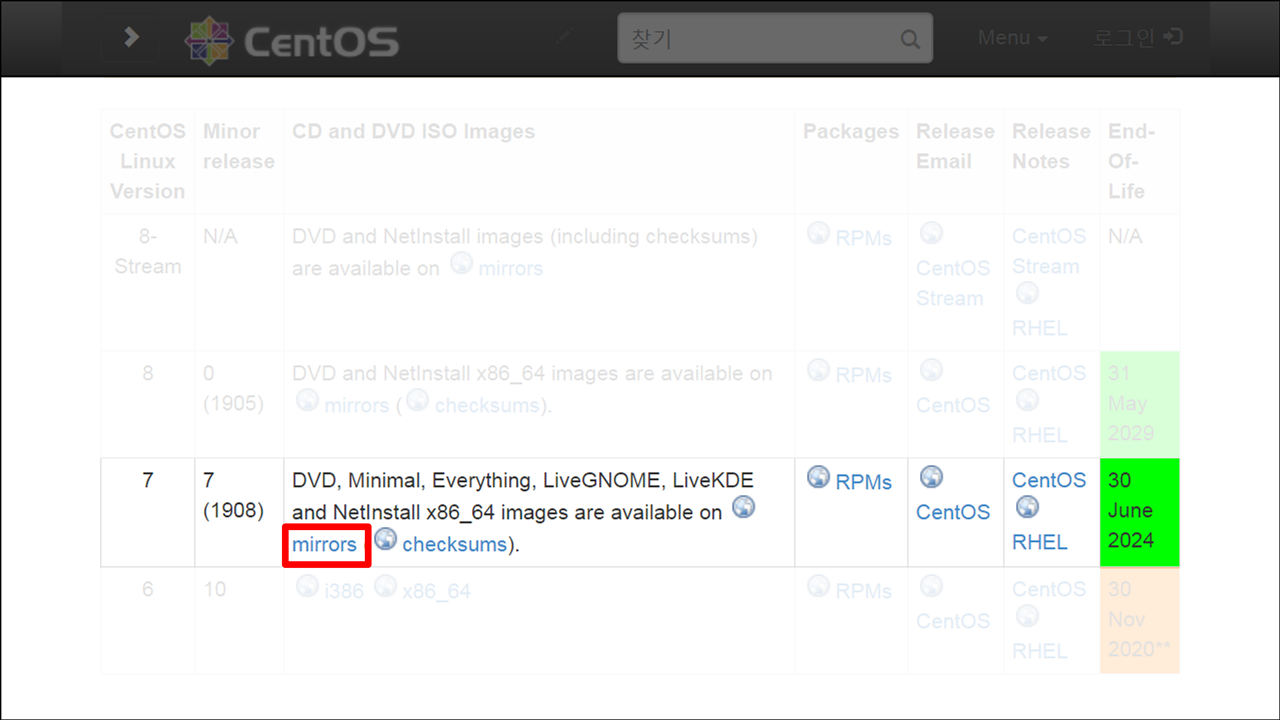 각 버전별로 다운로드 링크를 확인할 수 있는데요, 해당하는 버전을 찾아서 mirrors를 클릭합니다.