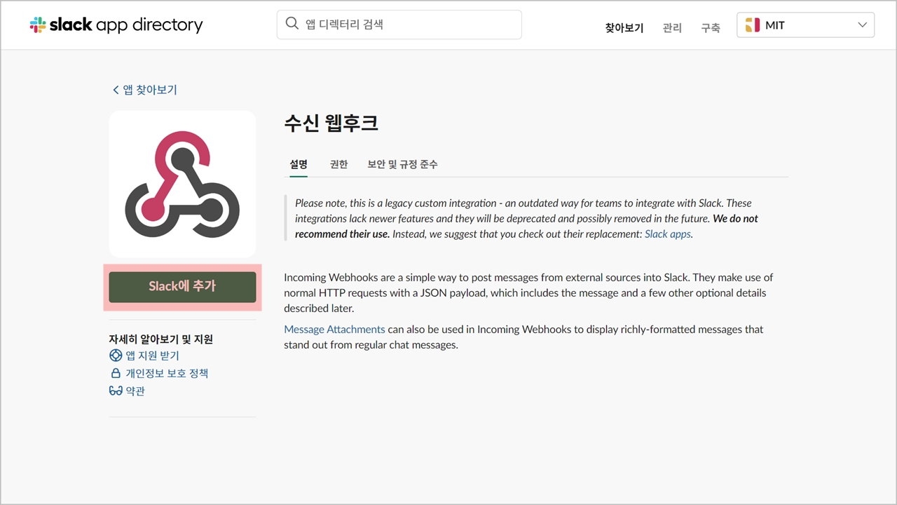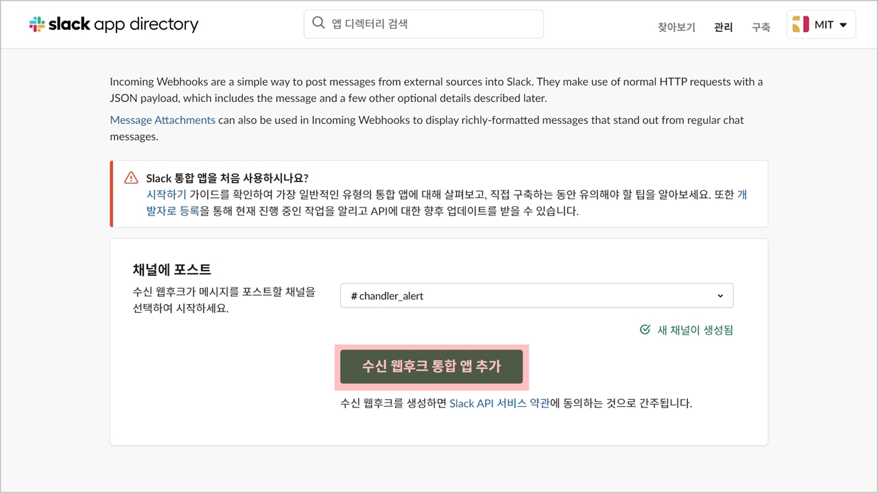 선택이 완료되었다면 하단의 ‘수신 웹후크 통합 앱 추가’를 클릭합니다.