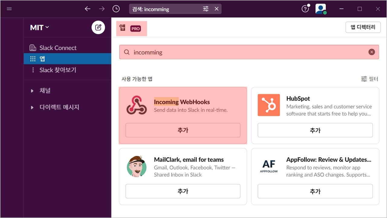 Slack App 목록에서 incomming WebHooks를 검색하여 추가를 선택합니다.