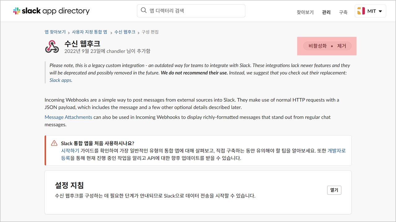 설정을 위한 웹 페이지는 이런 화면인데요, 우측 상단에 bot 을 비활성화 하거나 제거할 수 있는 메뉴가 있습니다. 추가로 ‘설명 지침’을 통해서 bot 을 사용하는 방법 등이 상세하게 설명되어 있으니, 초보자라면 해당 설명을 참고하시면 좋을 것 같습니다.