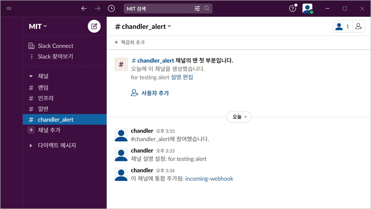 그럼 Slack의 채널에 다음과 같이 봇이 추가가 되는 것을 확인할 수 있습니다. 기본적으로 bot 의 이름은 incomin-webhook 으로 지정이 되는데요, 그냥 사용해도 무방하며, 관리를 편하게 하고 싶다면 웹 페이지에서 변경하면 됩니다.