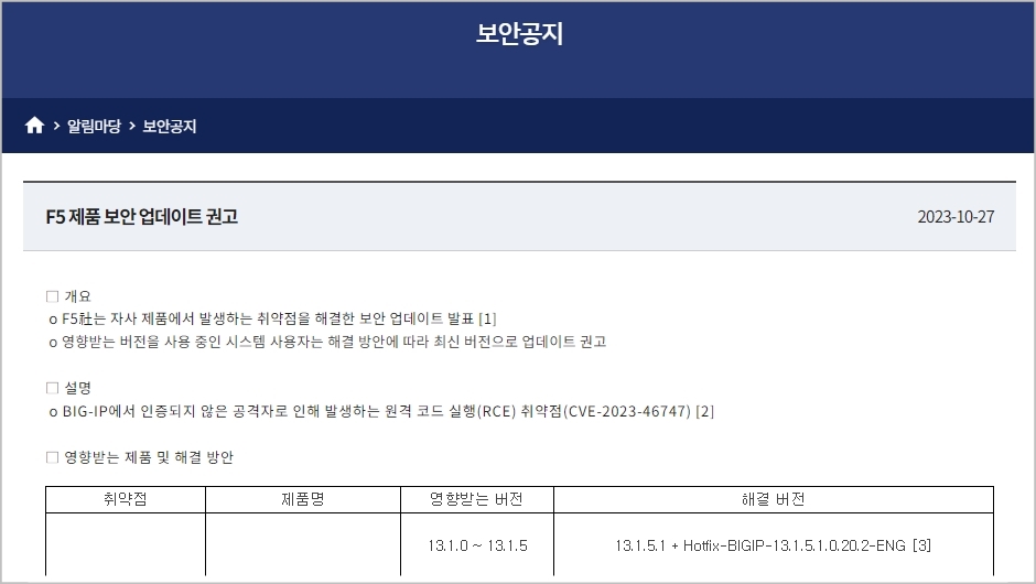 보안 취약점 조치 권고 - F5 제품 보안 업데이트 권고 (CVE-2023-46747)