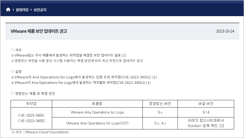 | KISA 공지 | KISA 공지 : VMware 제품 보안 업데이트 권고 | |