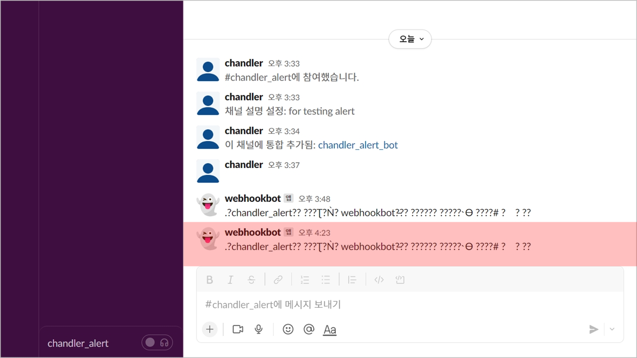 \"text\": \"이 항목은 #개의 chandler_alert에 포스트되며 webhookbot이라는 봇에서 제공됩니다.\",