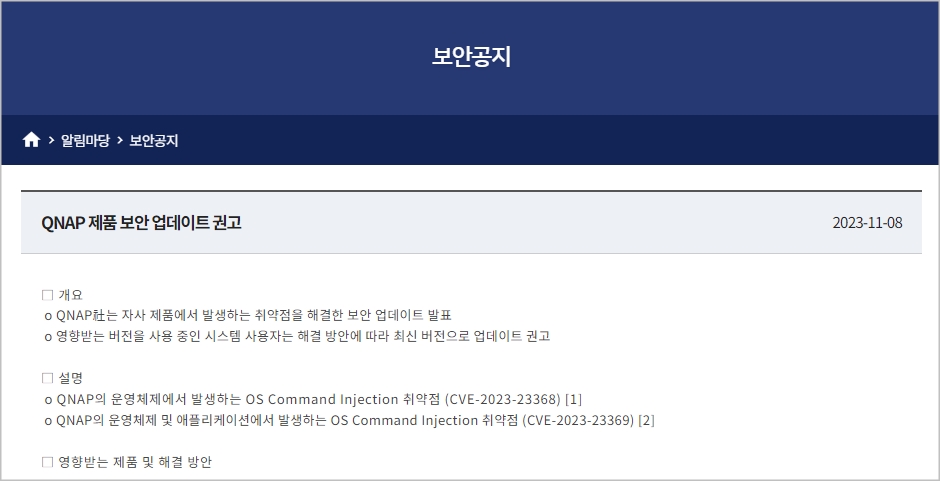 | QNAP 취약점 공지 1 | https://www.qnap.com/en-uk/security-advisory/qsa-23-31 | |