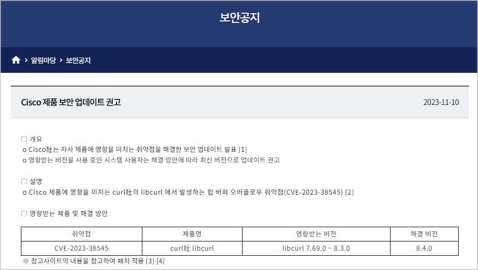 | libcurl | 7.69.0 ~ 8.3.0 | 8.4.0 이상 업데이트 |
