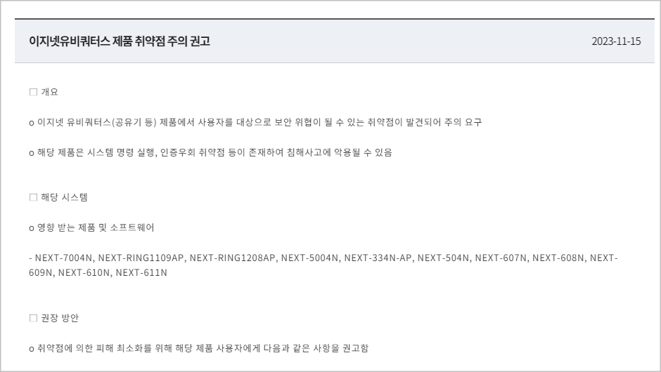 보안 취약점 조치 권고 - 이지넷유비쿼터스 제품 취약점 주의 권고