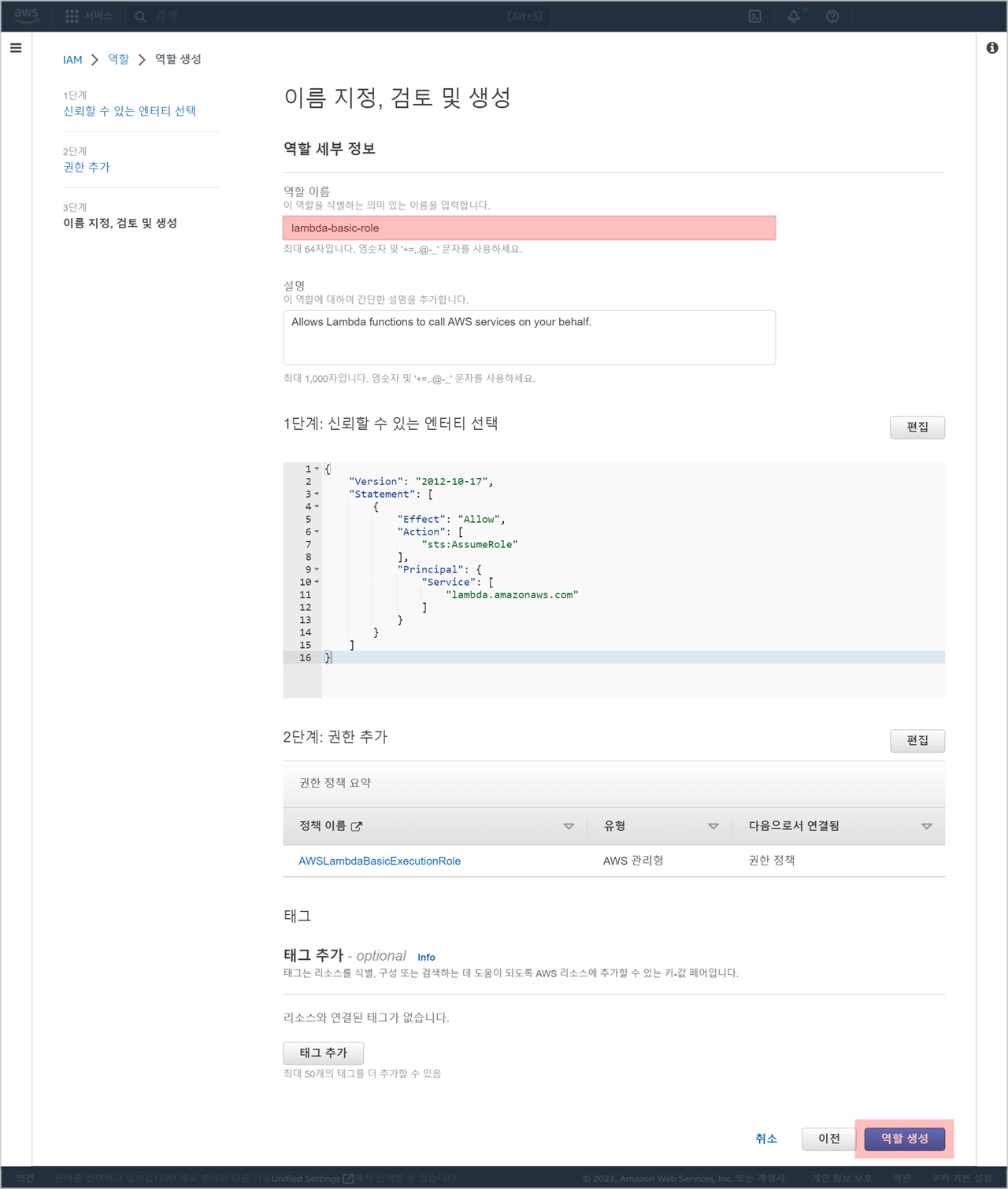 - lambda를 생성하려면 iam role 이 필수로 들어가야 합니다.