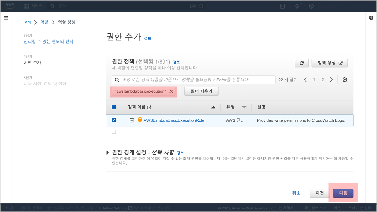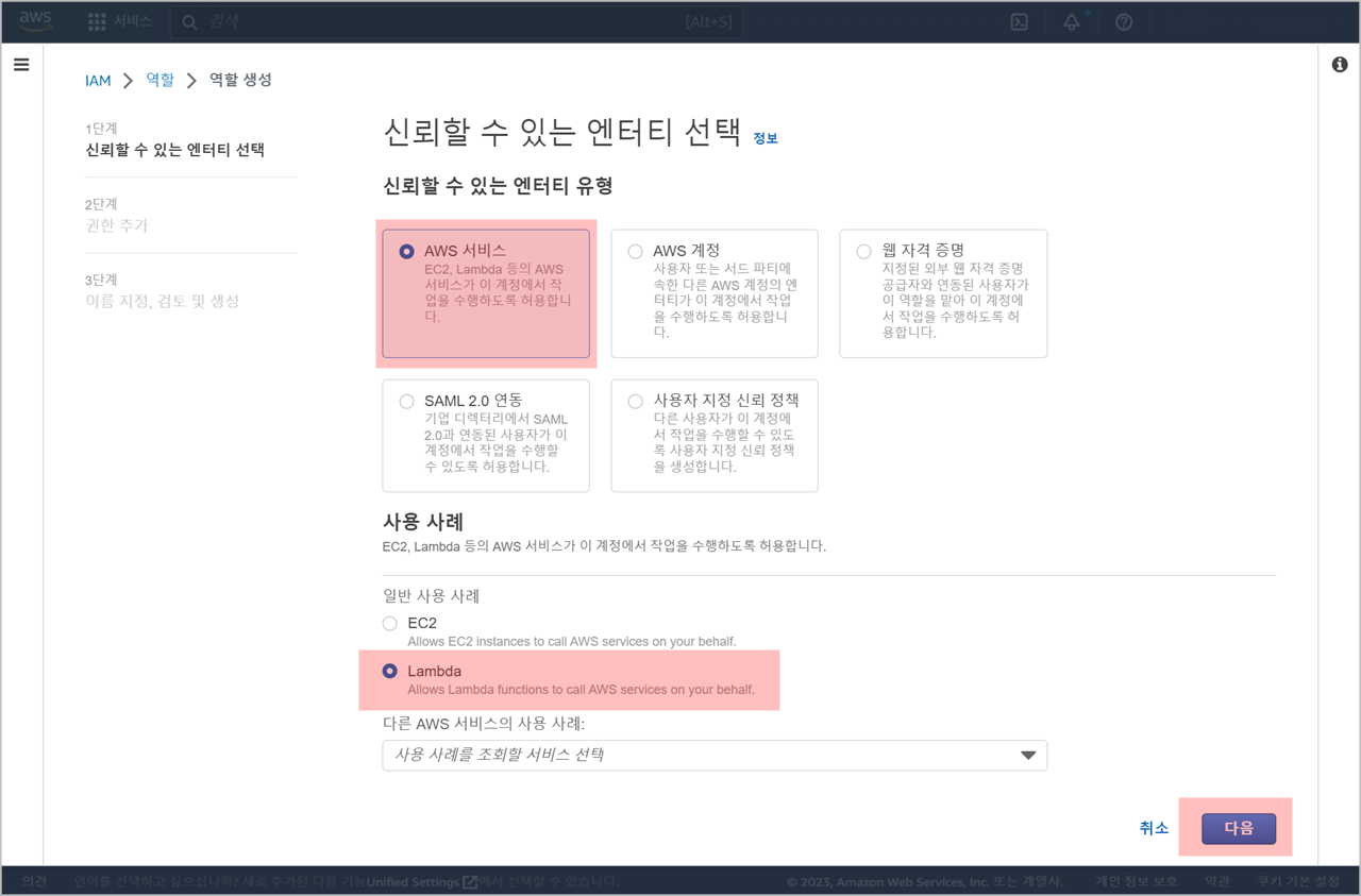 사용 사례는 Lambda를선택하고 제일 하단의 ‘다음’을 선택합니다.