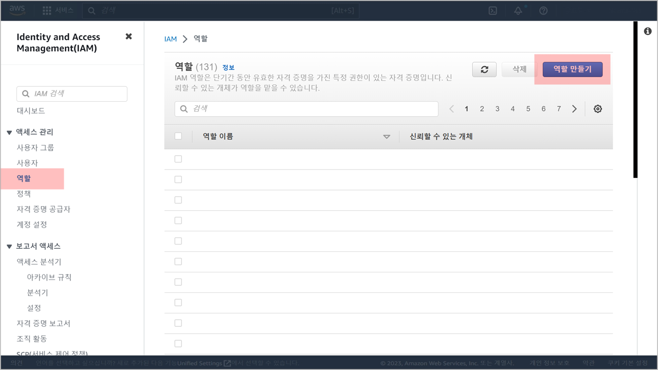 IAM 서비스로 이동하여 ‘역할’ 메뉴를 선택 후 ‘역할 만들기’를 클릭합니다.