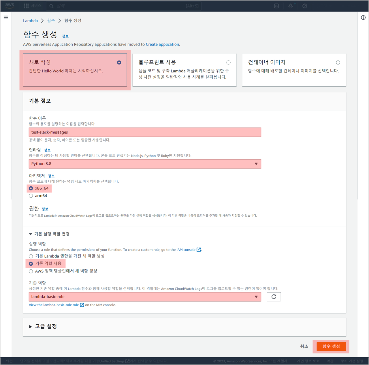 IAM은 Lambda에서 다른 AWS 서비스로 연결하는 경우가 아니라면 basic으로 생성한 role을 연결하면 됩니다.