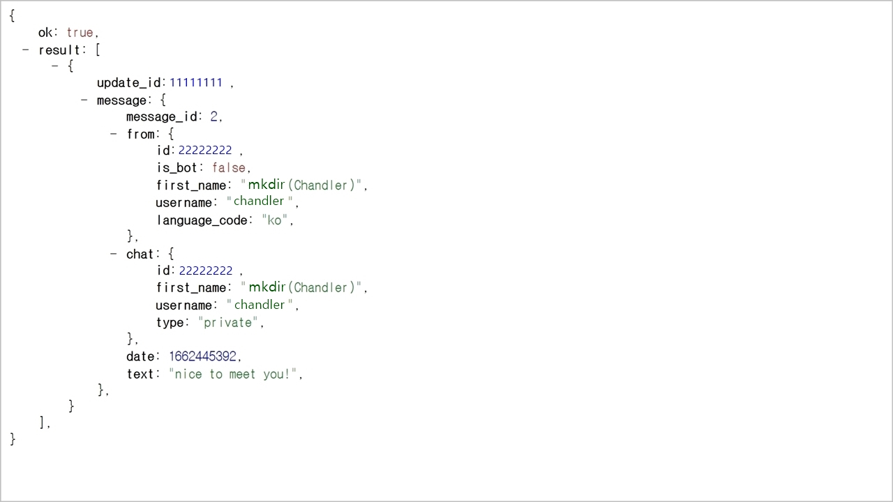 대충(?) 보기 좋게 정렬하면 다음과 같은 모양이 됩니다. 중간에 보면 chat 이 있고, 해당 항목의 하위에 id가 있는데요, 이 부분이 바로 chat id 입니다.