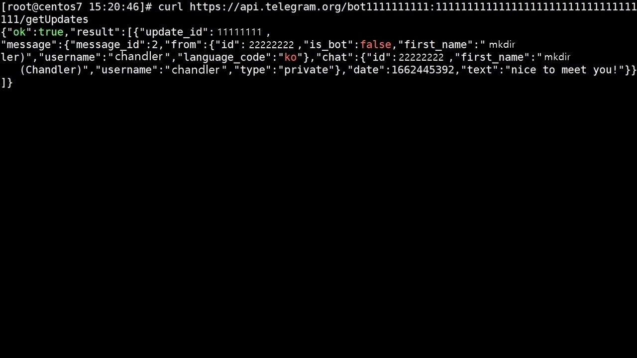 요런 형식으로 getUpdate api를 curl 명령어를 통해 날리거나, 웹 브라우저에 해당 주소를 입력해도 됩니다.