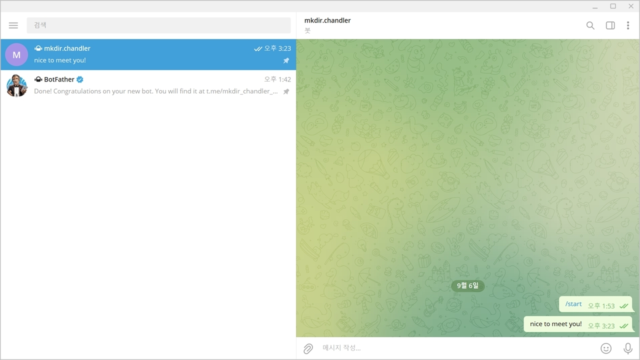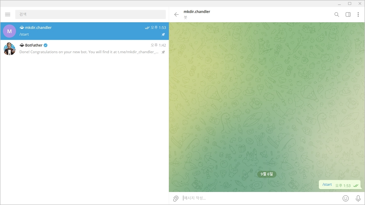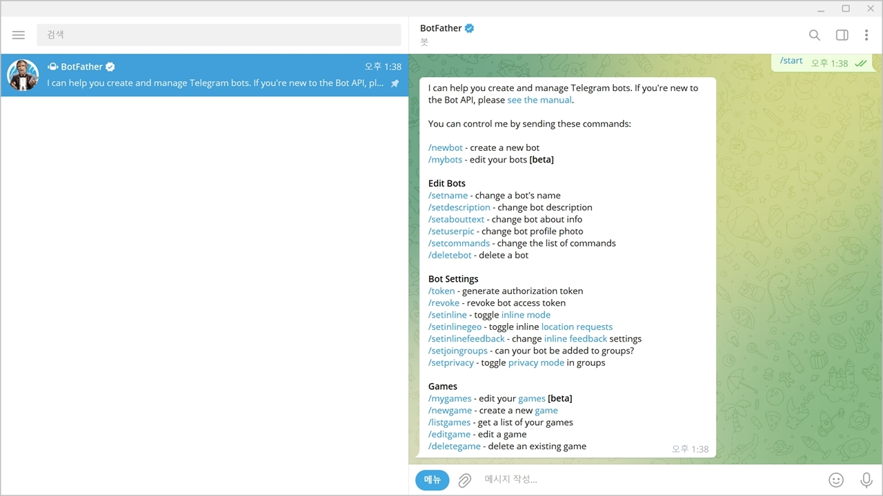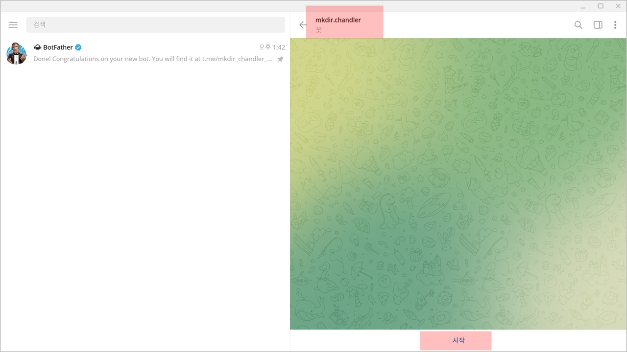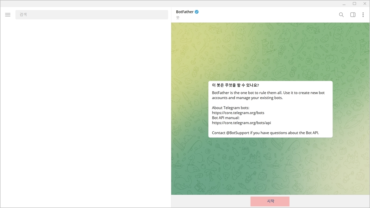 BotFather를 선택하면 대화창 하단에 ‘시작’ 이라는 버튼을 확인할 수 있습니다. 해당 버튼을 눌러서 대화를 시작하면 됩니다.