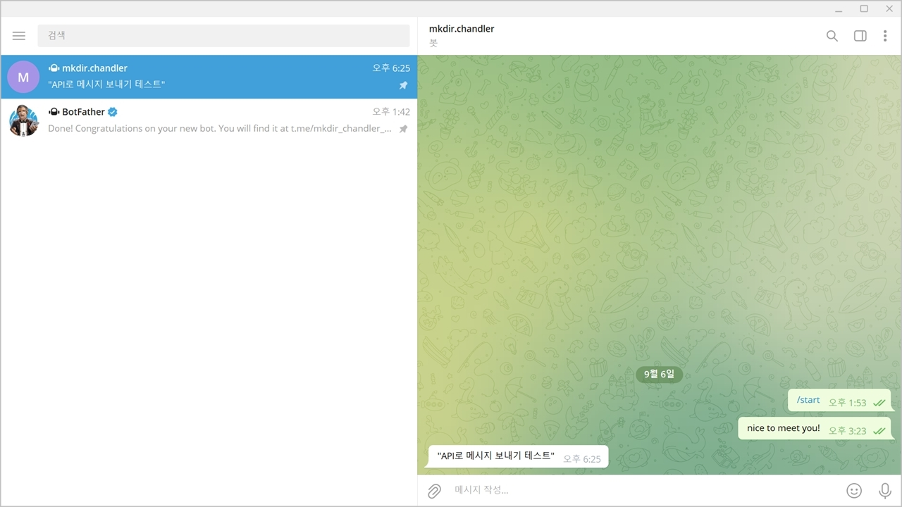 요렇게 채팅방에 활성화 되는 것을 확인할 수 있습니다. 이제 봇 생성은 완료되었는데요, 알람을 봇을 통해 받기 위해서는 다음 2가지가 필요합니다.