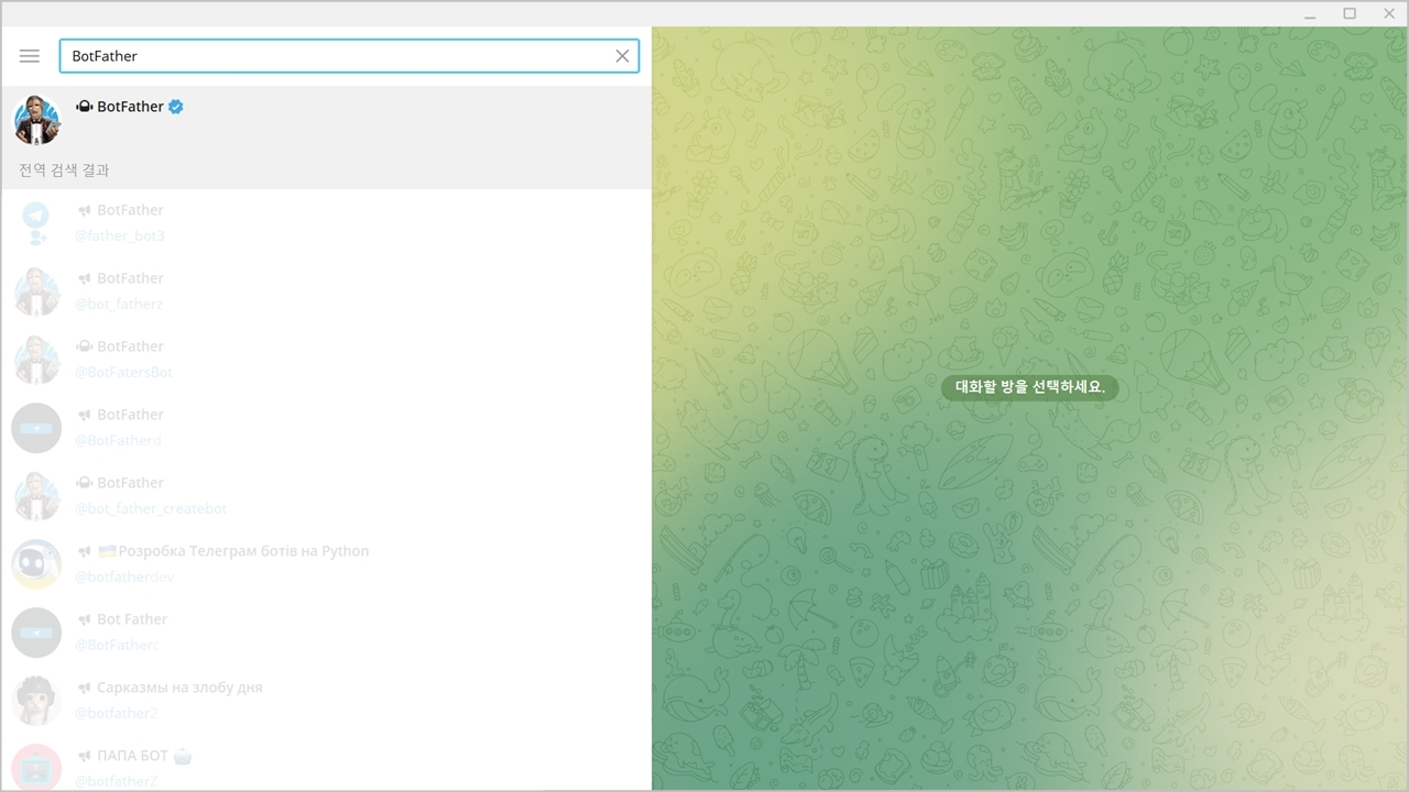 텔레그램에서 ‘BotFather’를 검색합니다. 제일 상단에 검색되는 봇을 선택하면 됩니다.