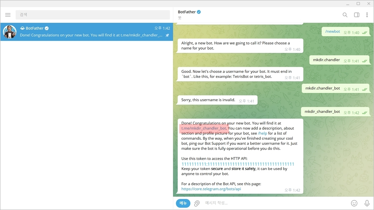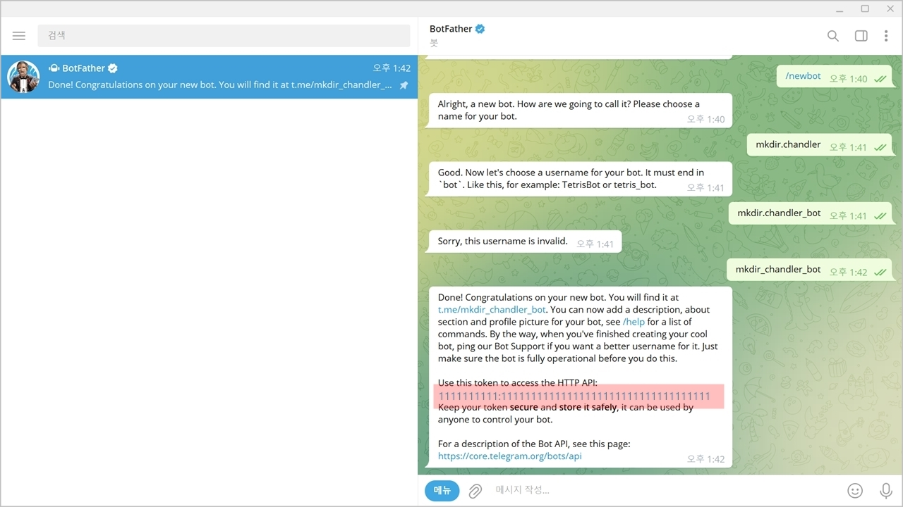 - username - bot 이름입니다. (bot의 이름은 맨 뒤에 _bot 을 붙여서 만들어야 하며, 중간에 . 은 지원하지 않습니다.)