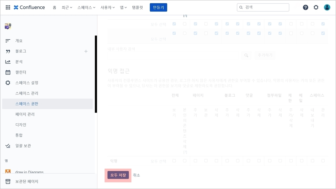 이후 체크박스로 해당 그룹의 권한을 부여하고 제일 아래의 ‘모두 저장’을 클릭합니다. 이후에 변경한 권한이 제대로 적용되었는지 확인해 보시면 됩니다!