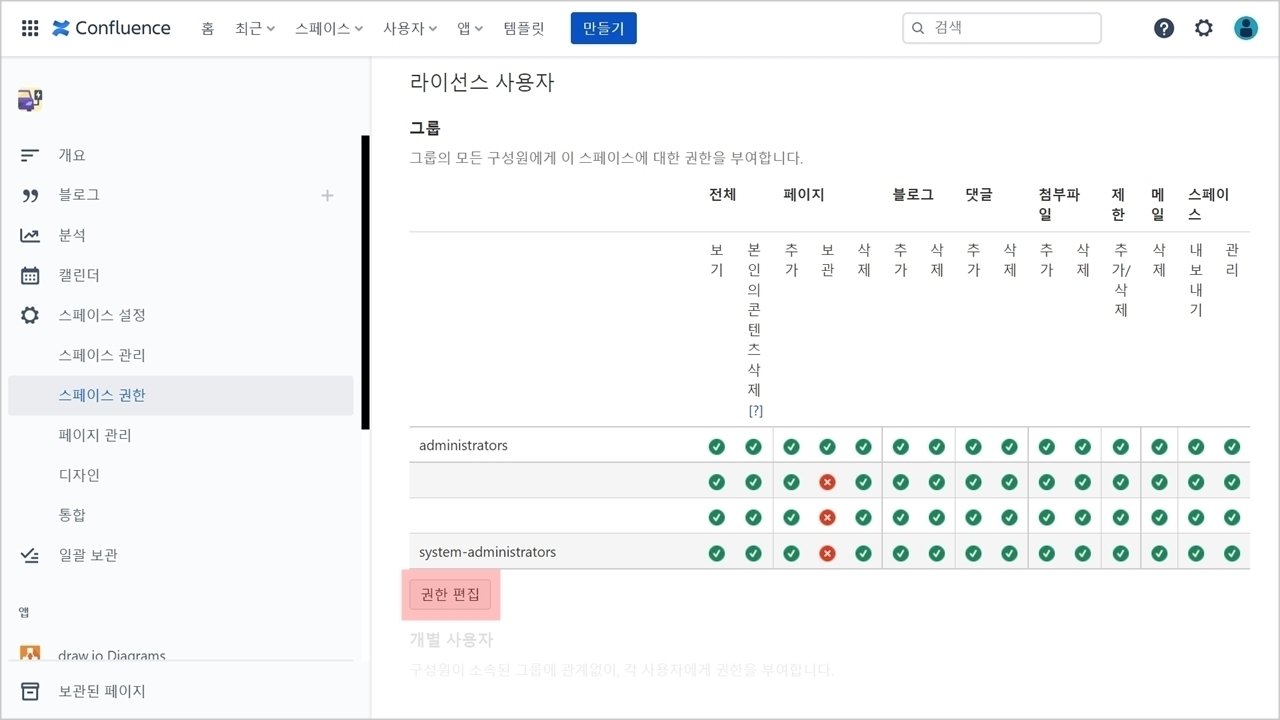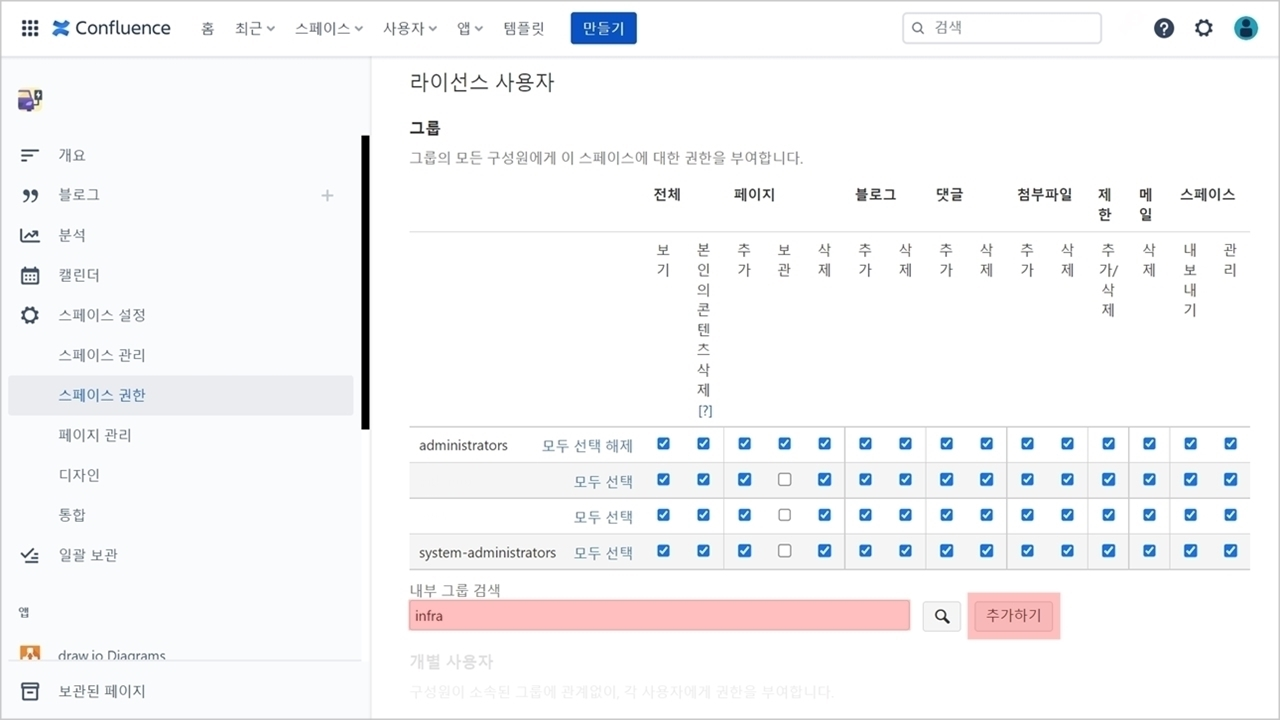 ㆍ사용자 / 그룹에 대한 권한은 각 스페이스별로 부여를 해야 합니다.