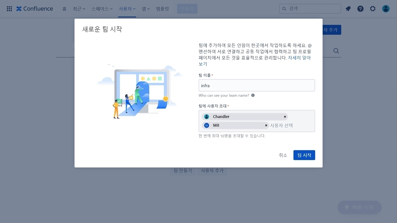 - 처음 만들 때는 10명까지 초대가 가능하고, 추후 팀 관리 메뉴에서 한 번에 50명까지 초대가 가능합니다.