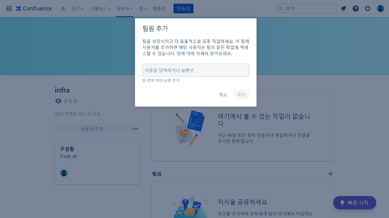 사용자 추가를 선택하면, 팀 구성원을 한번에 50명까지 추가로 초대가 가능합니다.