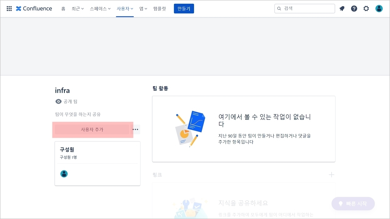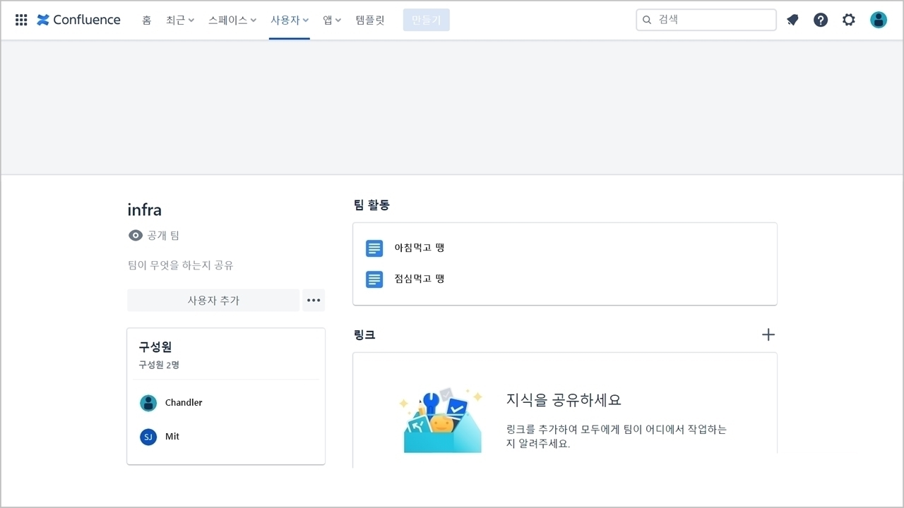 생성이 완료되면 구성원 및 팀 활동 등의 내용을 확인할 수 있습니다.