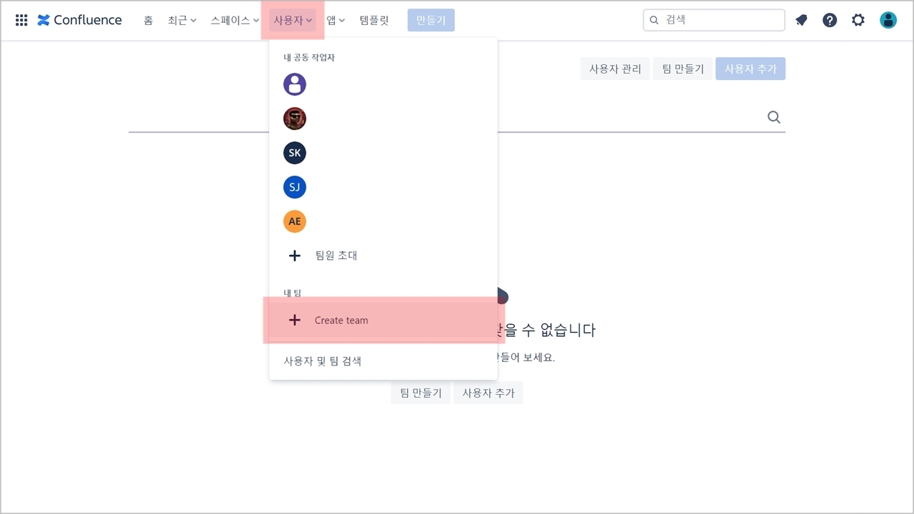 상단의 메뉴에서 ‘사용자 → 팀추가 (Create team)’을 선택합니다.