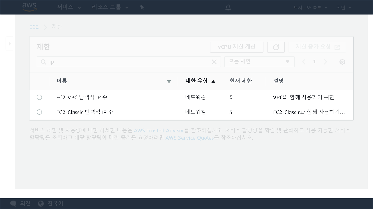 Elastic IP 의 경우 기본 5개로 제한이 되어 있습니다. 요즘에는 보안을 위해서 public ip는 사용을 하지 않는 경우도 많이 있지만 eip를 사용해야 하는 경우도 생각보다 많이 있기 때문에 가능하면 초반에 limit을 증가시켜 두는 것이 좋습니다.