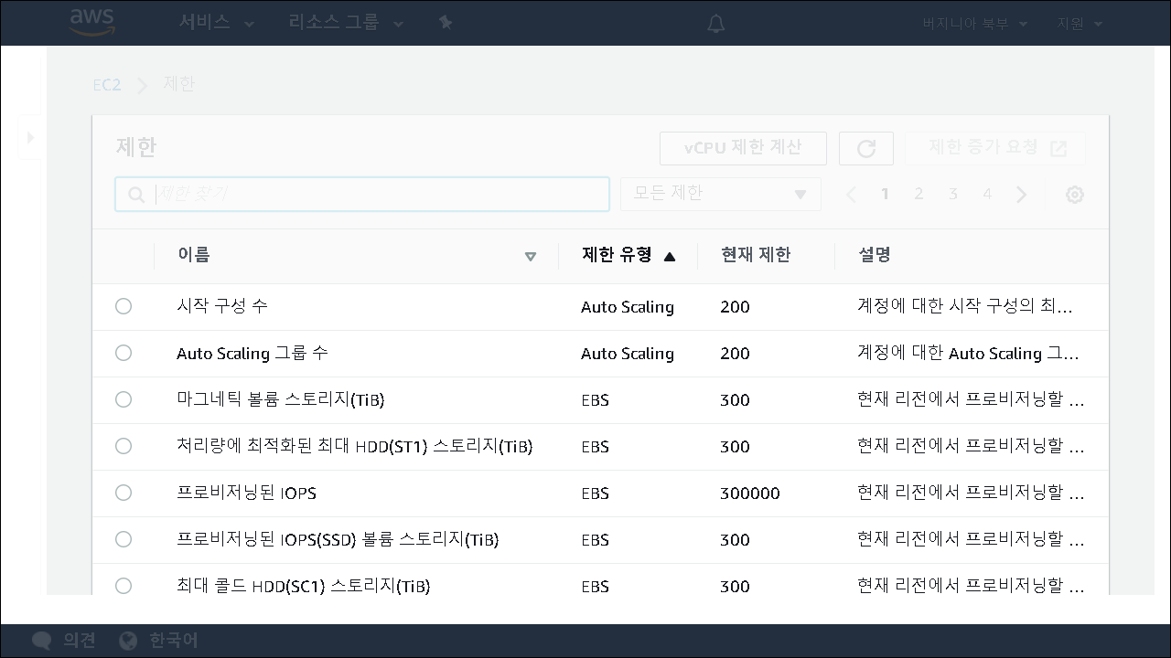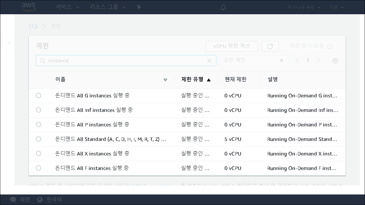 EC2 instance의 default 값은 vCPU를 기준으로 산정되며, default는 5 vCPU 입니다. 개인적으로 EC2의 limit 계산법은 아직도 100% 정확하게 계산을 못하고 있습니다. (제 능력이 부족해서,,,ㅠㅠ) 확실한 건 초반에 limit 증가를 해 두시는 것이 원활한 테스트 및 서비스를 할 수 있는 방법이라는 점입니다.