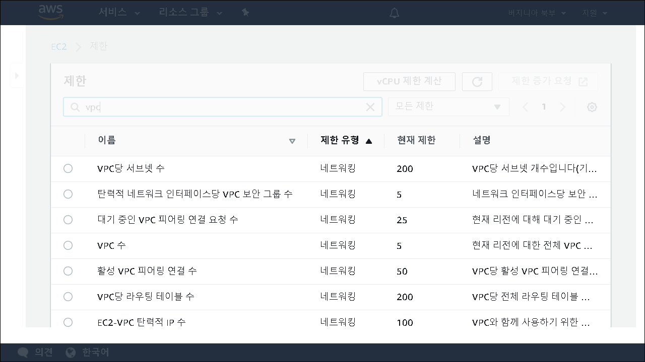 마지막으로 VPC의 default 개수는 5개입니다. 사실 vpc 자체는 많이 생성을 안 하기 때문에 LB와 마찬가지로 default로만 사용하는 경우도 많습니다만, 많이 생성하려는 경우 꼭 limit을 증가해야 합니다.