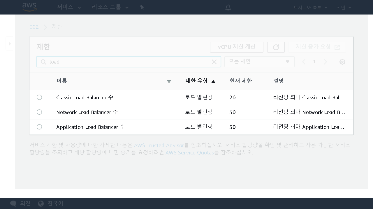 Load Balancer도 상당히 많이 사용하는 서비스이기 때문에 limit 보다 많이 사용할 것 같다면 미리 증가 요청을 해 두는 것이 좋습니다. (근데 대부분 LB는 기본 사용량에서 넘어가지는 않더라구요)
