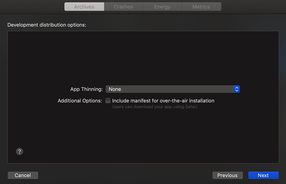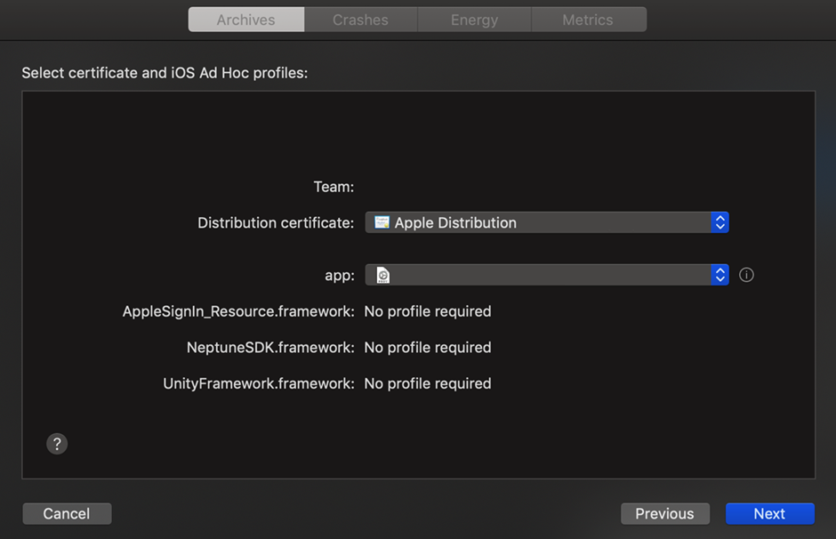 Ad Hoc 또는 App Store Connect를 선택한 후, Next를 클릭합니다.
