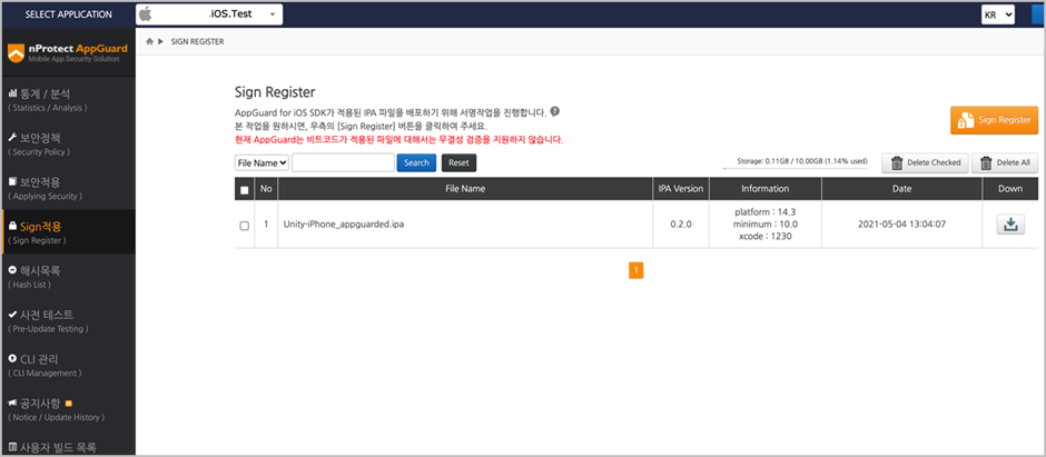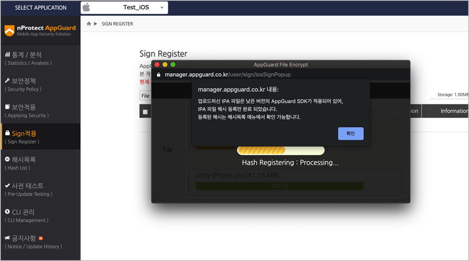 빌드에 낮은 버전의 Appguard SDK가 적용되어 있으면 위와 같이 해시 등록만 가능하니 SDK 업데이트가 필요합니다. 라는 메시지가 팝업 됩니다.