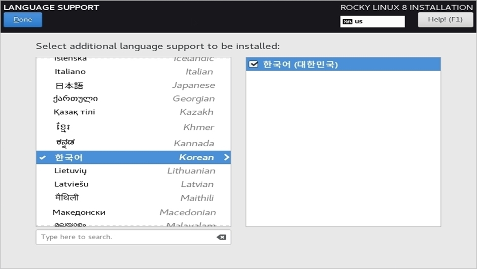 OS 에서 사용할 언어를 선택하는 메뉴입니다. 한국어를 찾아서 선택하고 왼쪽 상단의 Done을 선택합니다.