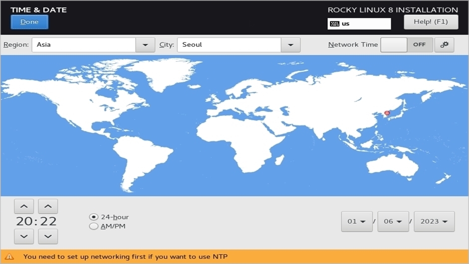 OS 에서 사용할 Timezone 을 선택하는 메뉴입니다. Asia - Seoul 을 선택한 다음 왼쪽 상단의 Done을 선택합니다.