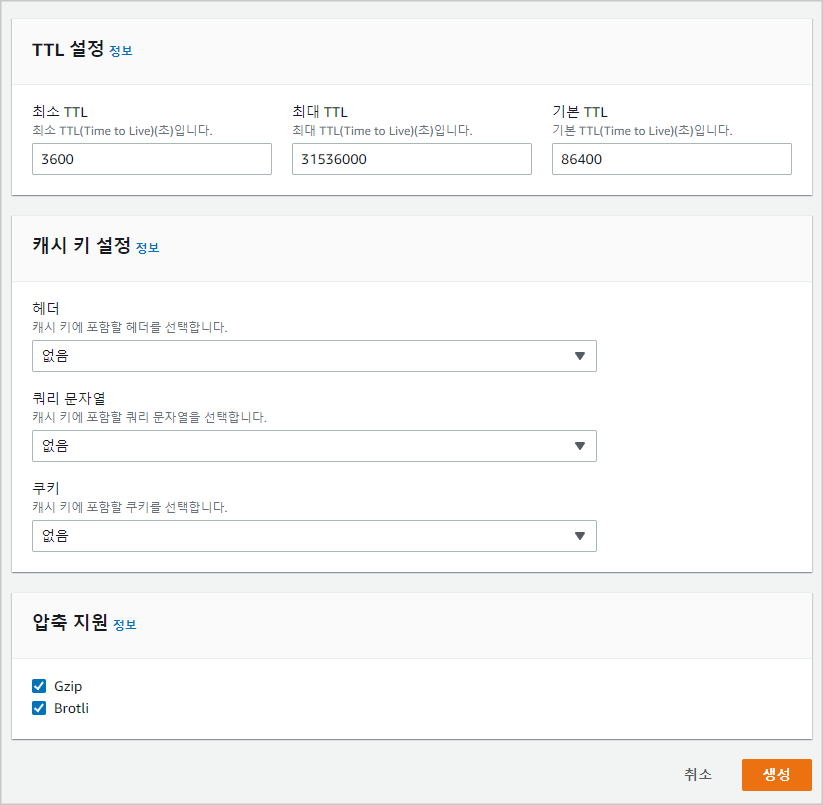- 캐싱 사용 시 최소 값이 1로 설정되어 있음 → 3600 이상으로 변경 필요