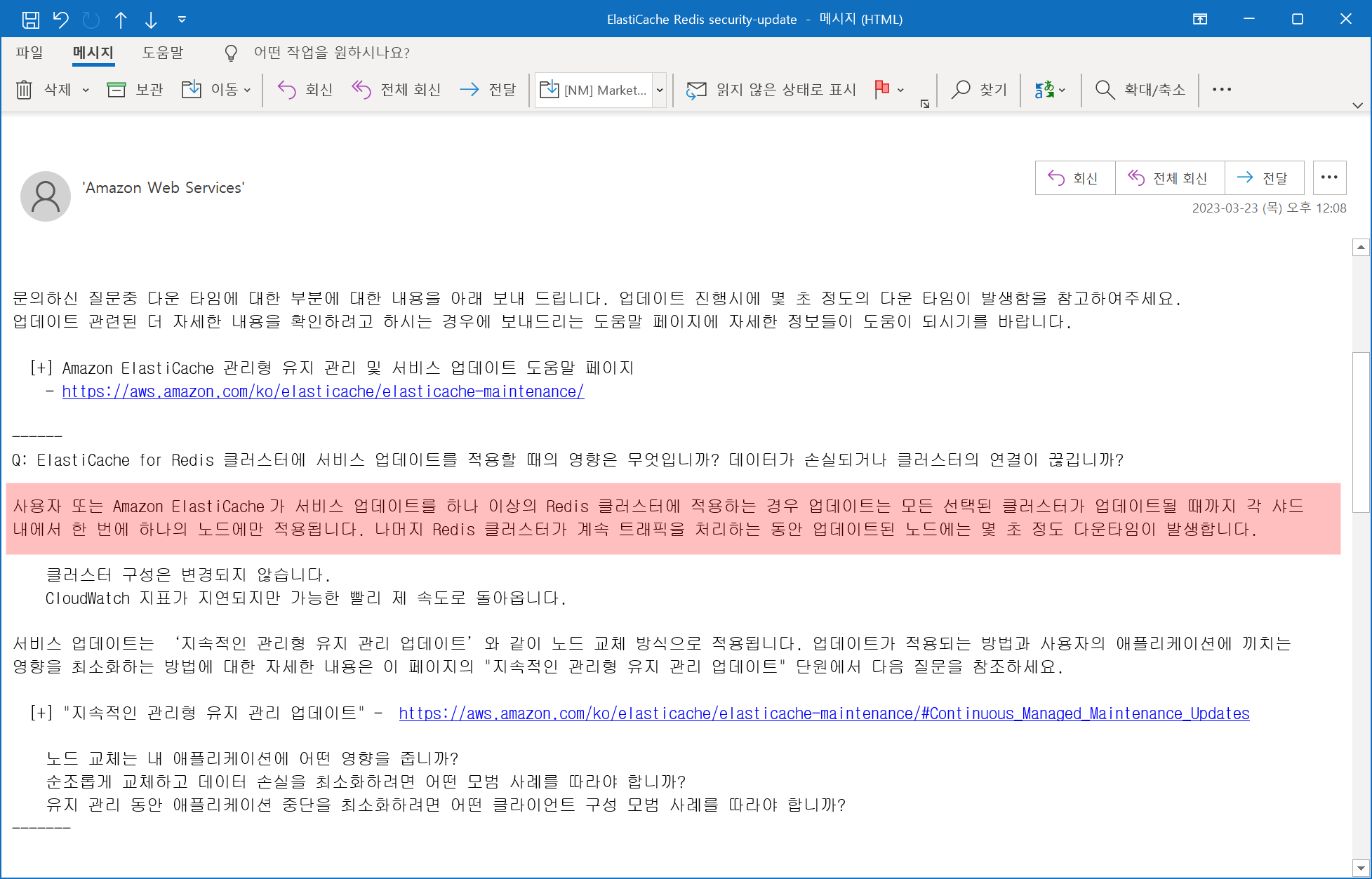 평화롭게 월루를 하던 어느 날 AWS로부터 한통의 메일 (Notification) 을 전달받게 됩니다. Security Update가 나왔다는 내용인데 강제로 업데이트를 진행한다는 내용이 포함되어 있었습니다.