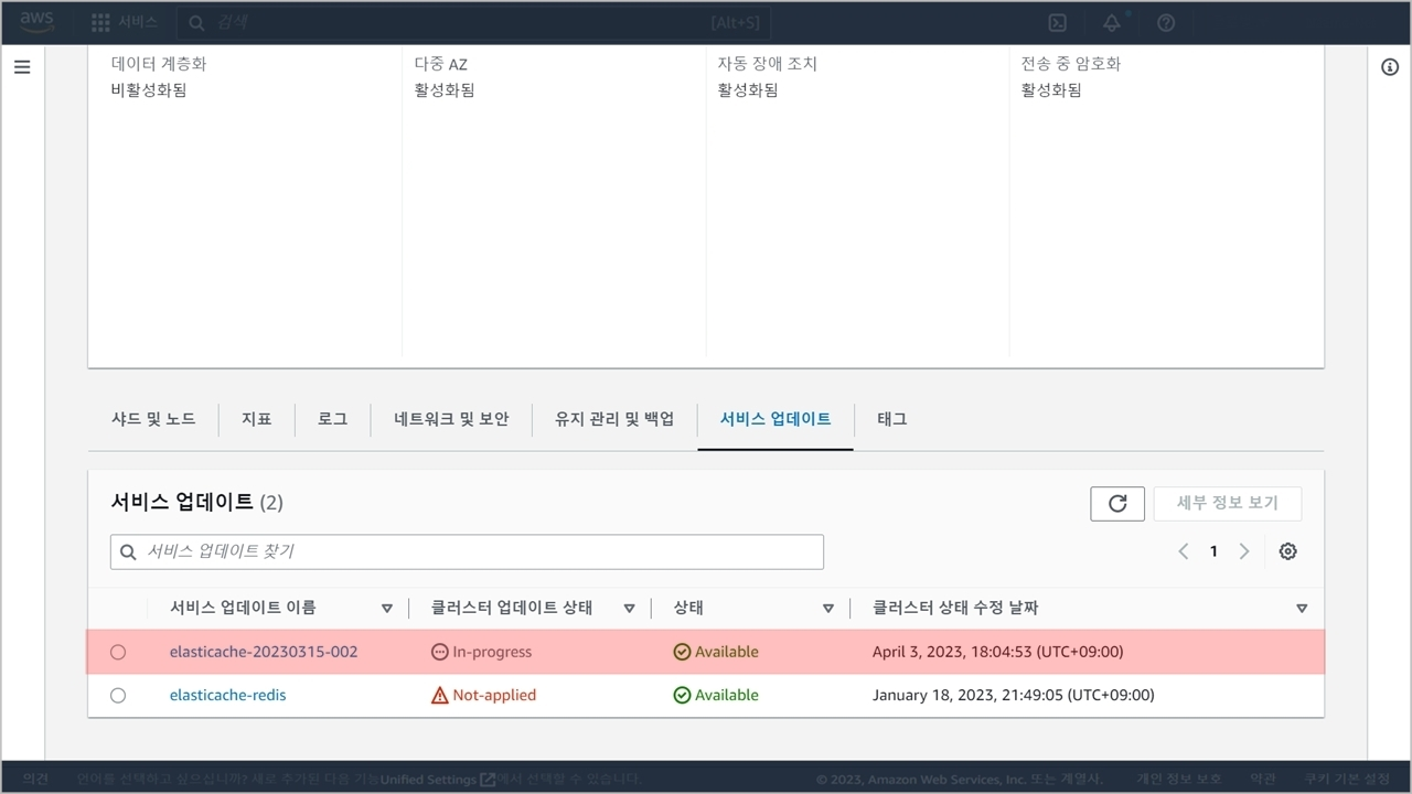해당 Redis의 ‘서비스 업데이트’ 탭에서 보면 진행 중인 상태 확인이 가능합니다.