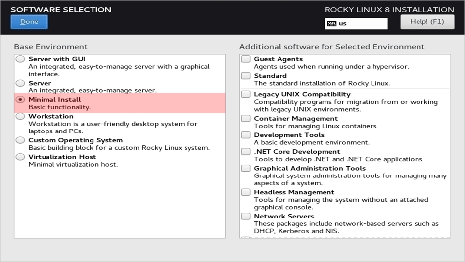 Base Environment 에서 Server with GUI 혹은 Minimal Install 중에서 선택하고 왼쪽 상단의 Done을 선택합니다.